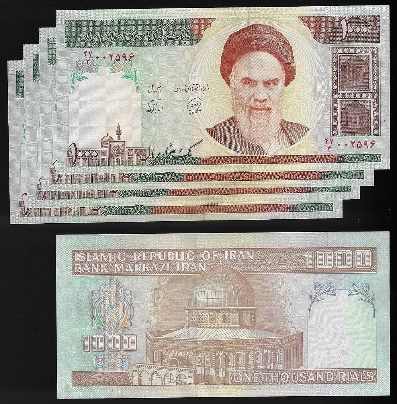 | 79478 | Irã, 1.000 Rials, 1992, Pick-143b, 5 cédulas, Aiatolá Khomeine, FE (catálogo US$25) | 42,00 | Foto |