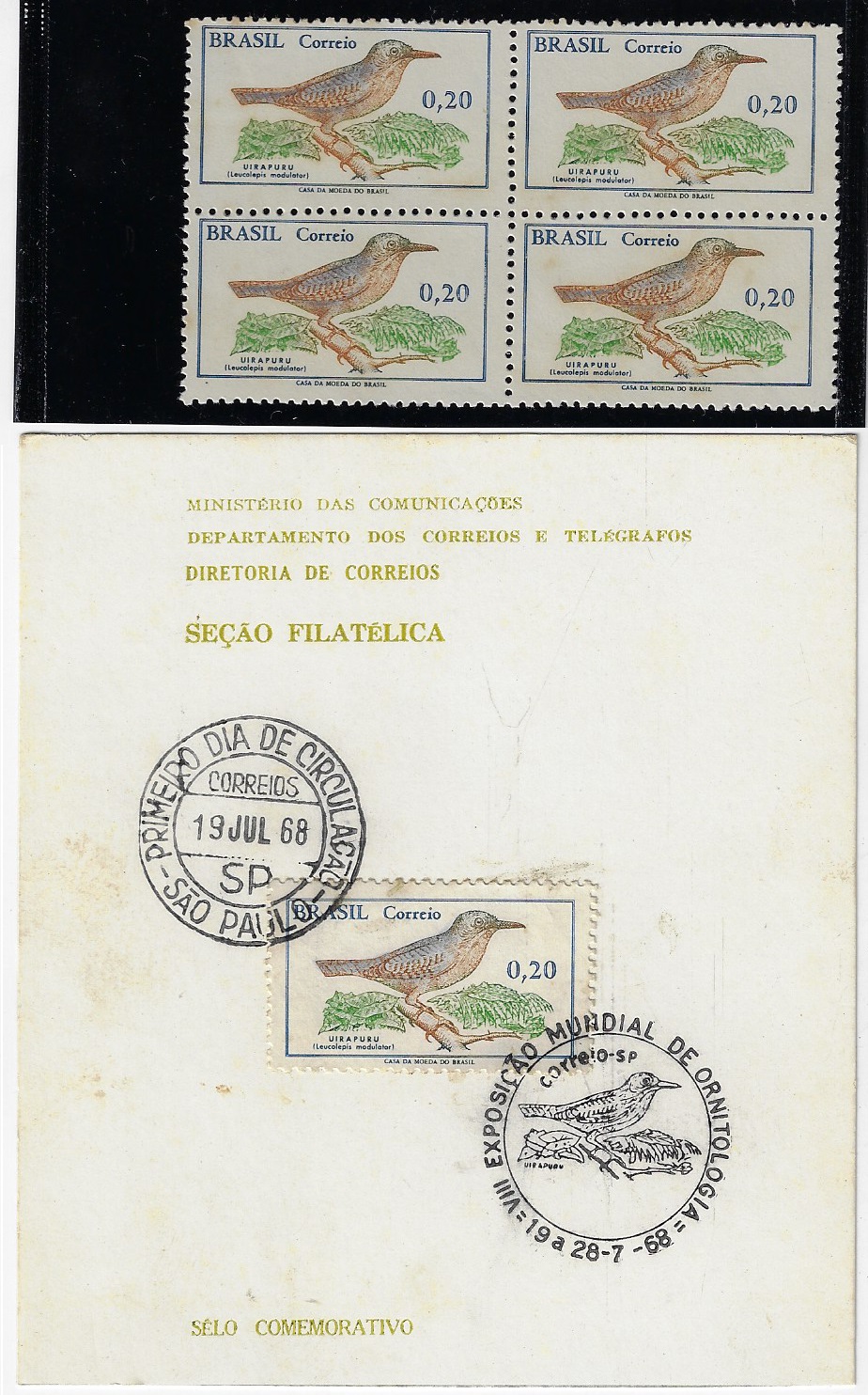 | 54007 | 601/601A, Pássaros Brasileiros - Uirapuru, quadra com filigrana em 2 selos, ou seja, 2 selos 601 e 2 selos 601a, novo sem goma (catálogo 42,4 UF) + folhinha | 43,00 | Foto |