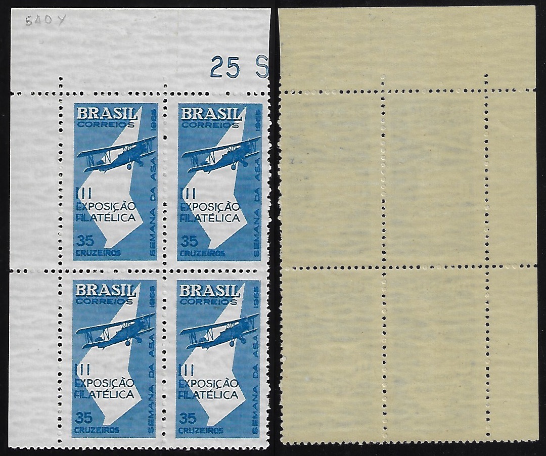 | 56019 | 540Y, Semana da Asa e III Exposição Filatélica, avião monomotor biplano, quadra em papel marmorizado, mint (48 UF) | 25,00 | Foto |