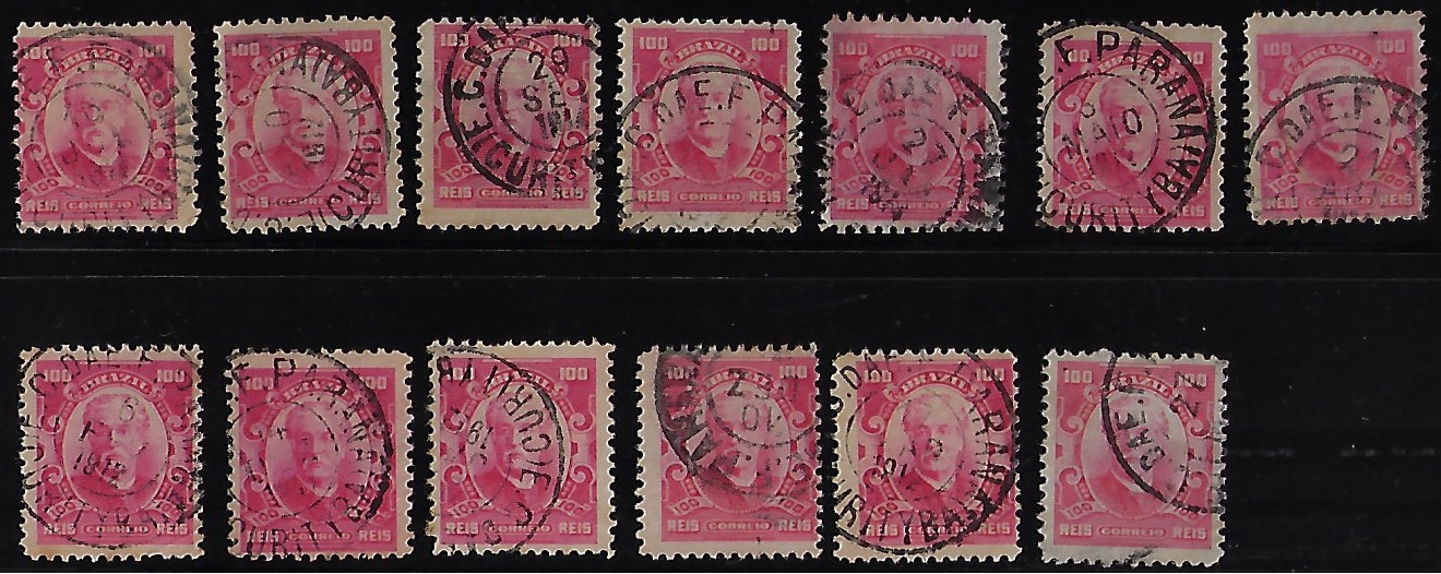 | 70642 | Acumulação, 1912/1914, 13 selos regulares 100 Réis, todos com o carimbos "E. C. da E. F. Paraná (Curytiba)" | 30,00 | Foto |