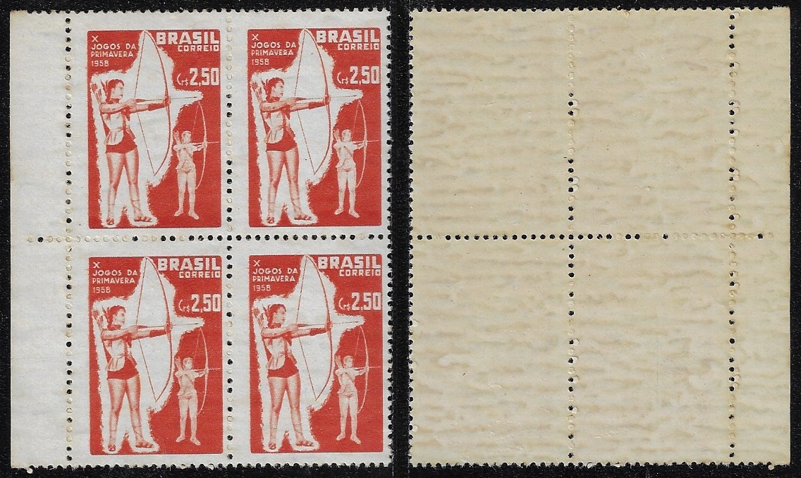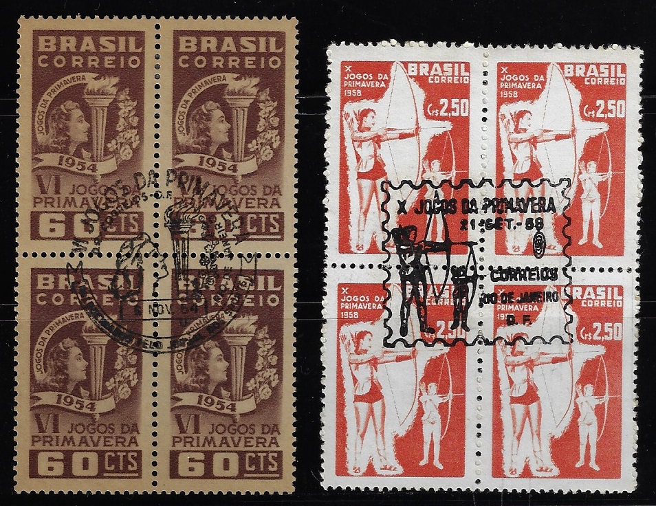 | 73521 | 354 e 422, Jogos da Primavera, Atleta Feminina, Tocha, Arqueiro, Arco e Flecha, quadras com carimbo comemorativo | 10,00 | Foto |