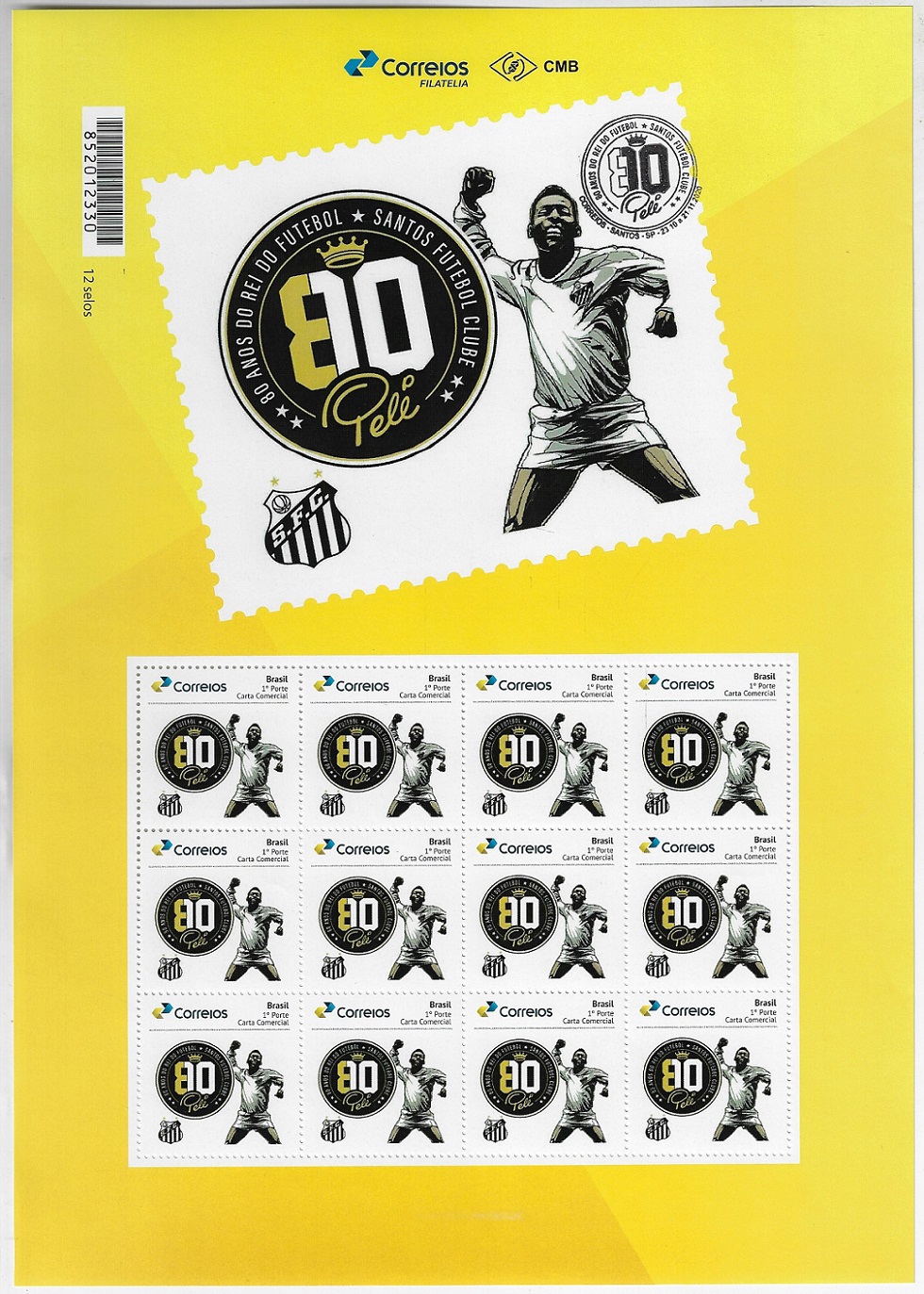| 79974 | Personalizado emitido em 2020 alusivo aos 80 Anos do Rei do Futebol, Pelé, Santos Futebol Clube, folha completa com 12 selos personalizados, mint | 80,00 | Foto |