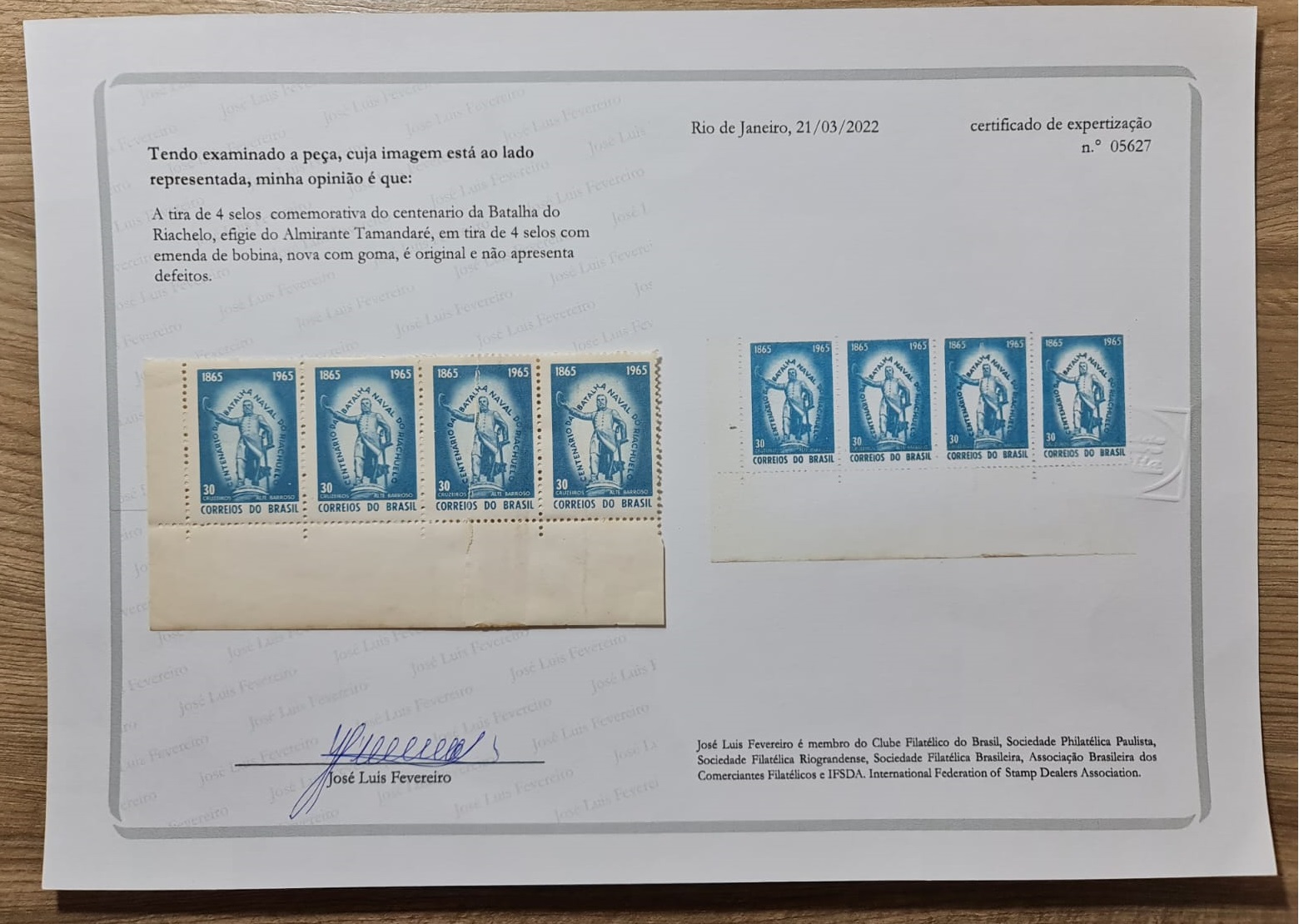 | 80116 | 530, Centenário da Batalha Naval do Riachuelo, Almirante Barroso, 30 Cruzeiros, tira 4 com selos com emenda de bobina, sem uso, acompanha Certificado de Autenticidade | 100,00 | Foto |