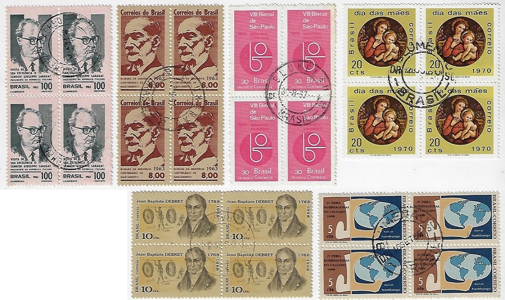 | 80923 | 502, 537, 538, 616, 630 e 674, conjunto de 6 quadras de selos comemorativos entre 1963 e 1970, com carimbos "Blumenau" (8,4 UF) | 10,00 | Foto |