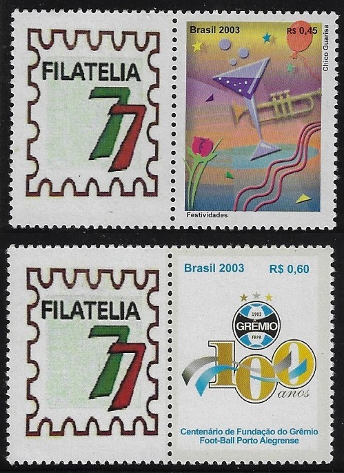 | 81131 | 2532 e 2540, 2 selos personalizados Grêmio e Festividades, ambos alusivos a Filatelia 77 | 15,00 | Foto |