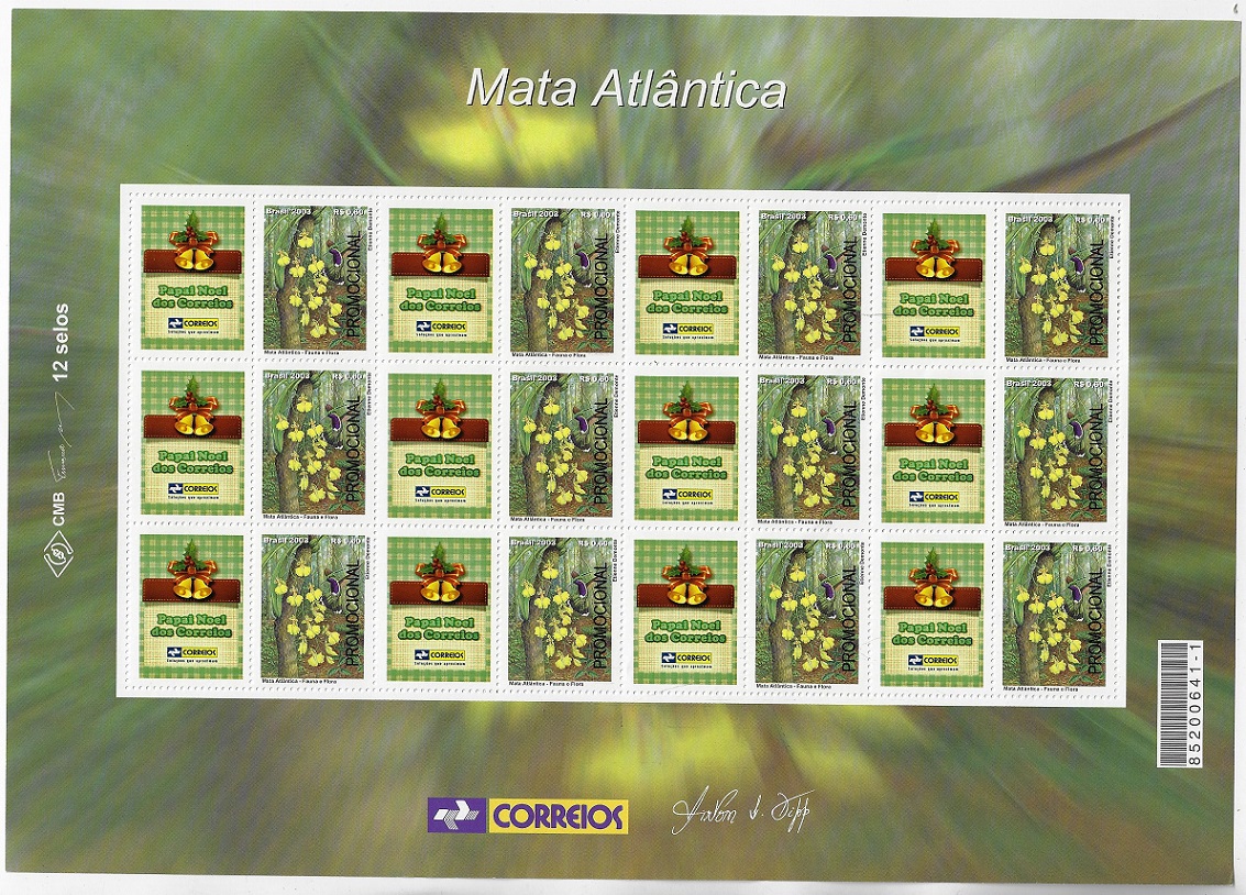 | 82011 | 2541, Mata Atlântica - Fauna e Flora - Orquídea e Beija-Flor, com sobrestampa "Promocional", folha completa com 12 selos personalizados Papai Noel dos Correios, Natal, mint | 195,00 | Foto |
