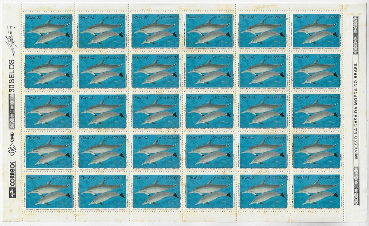 | 82449 | 1777, Fauna da Ilha de Fernado de Noronha, Golfinho, folha com 30 selos, leves pontos amarelados, sem uso (42 UF) | 17,00 | Foto |
