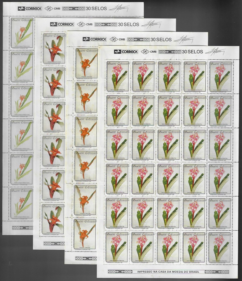 | 83662 | 1805/1808, Flores de Bromélias da Mata Atlântica, 30 séries completas em folhas, leves pontos amarelados (72 UF) | 72,00 | Foto |