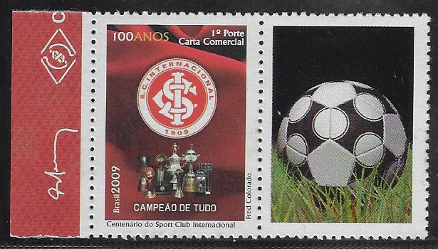 | 83808 | 2780, selo personalizado 100 Anos do Sport Clube Internacional, emitido em 2009 retratando bola de futebol no gramado, esporte, distintivo, troféu | 10,00 | Foto |