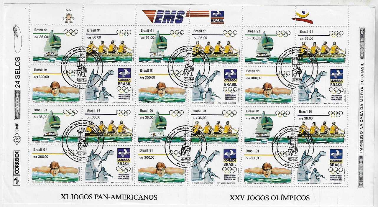 | 83992 | 1727/1729, XI Jogos Pan-americanos em Havana / Cuba e XXV Jogos Olímpicos em Barcelona / Espanha, folha completa com carimbo dos 30 Anos do Conselho Estadual de Educação do Rio Grande do Norte, mint (24 UF) | 24,00 | Foto |