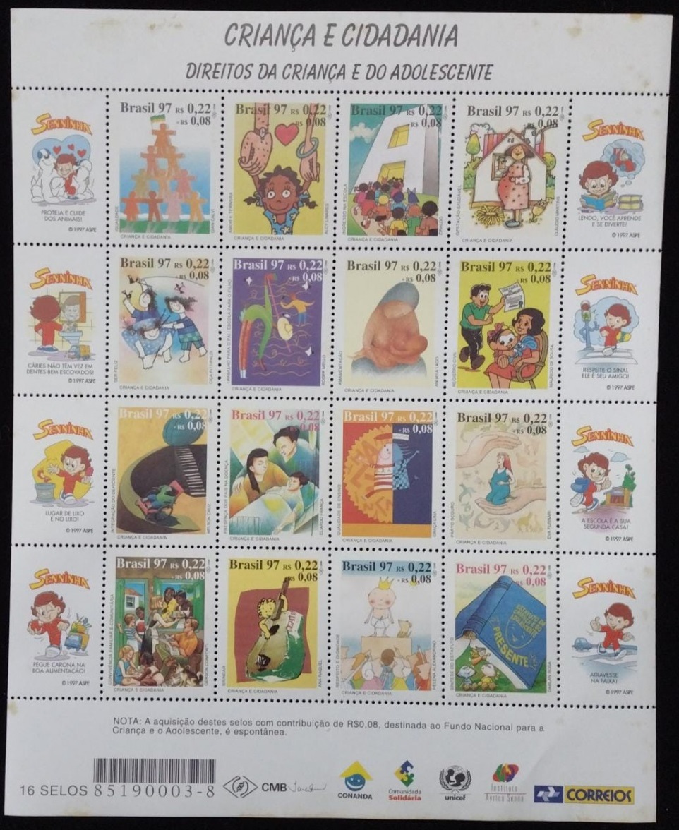 | 84692 | 2051/2066, minifolha completa com 16 selos alusivos a Criança e Cidadania, Direitos da Criança e Adolescente, vinhetas retratando o personagem Senninha, homenagem ao piloto de fórmula 1 Ayrton Senna, novo com pontos amarelados (32 UF) | 32,00 | Foto |