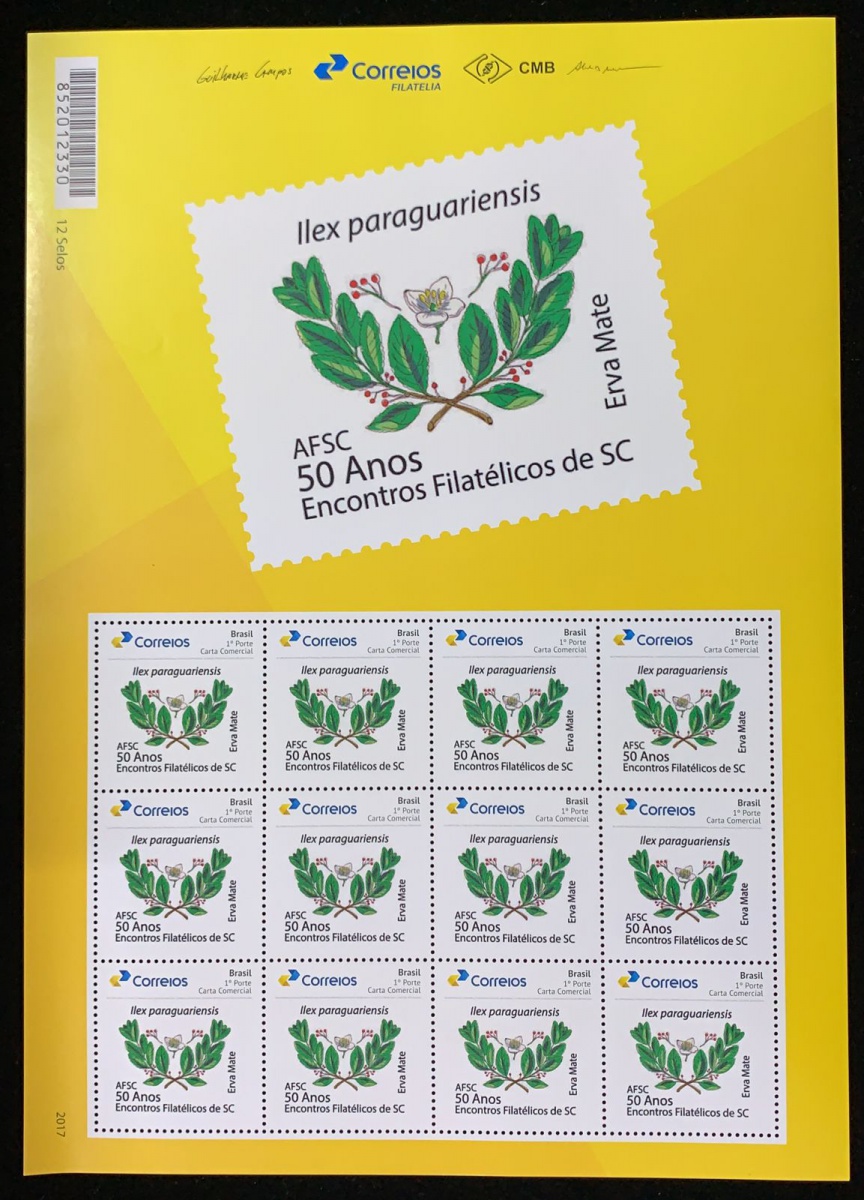 | 84901 | Folha completa emitida em 2019 com 12 selos personalizados alusivos aos 50 Anos de Encontros Filatélicos da Associação Filatélica de Santa Catarina, figurando Erva Mate, mint | 80,00 | Foto |