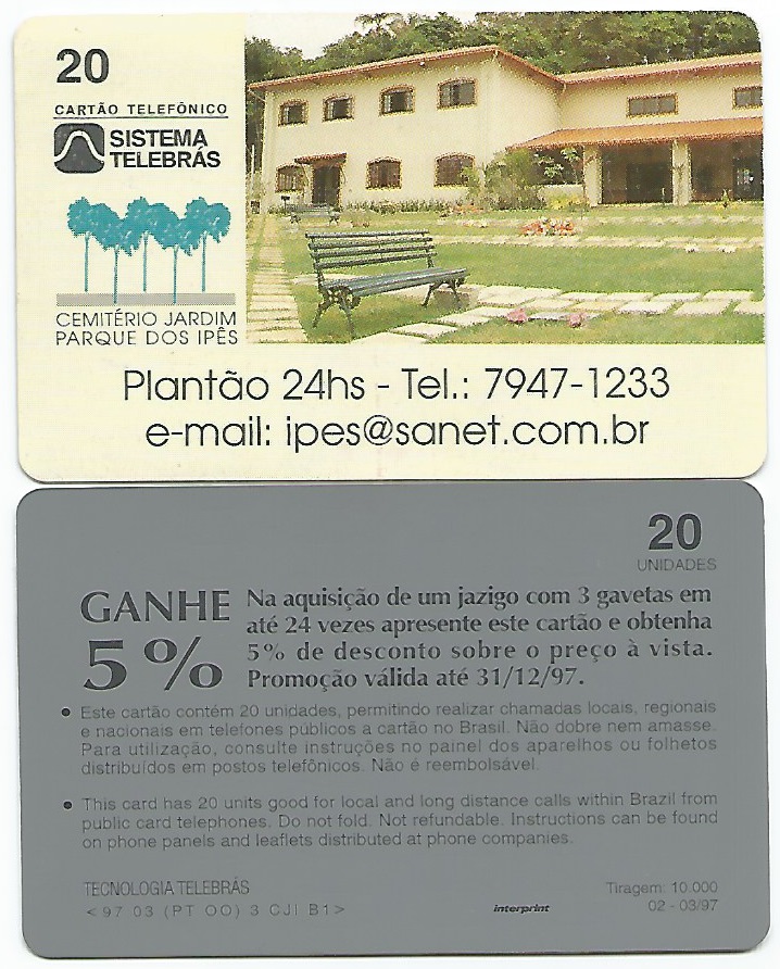 | 15079 | Telebrás, 1 cartão telefônico promocional "Cemitério Jardim Parque dos Ipês", 1997, tiragem 10.000, usado | 5,00 | Foto |