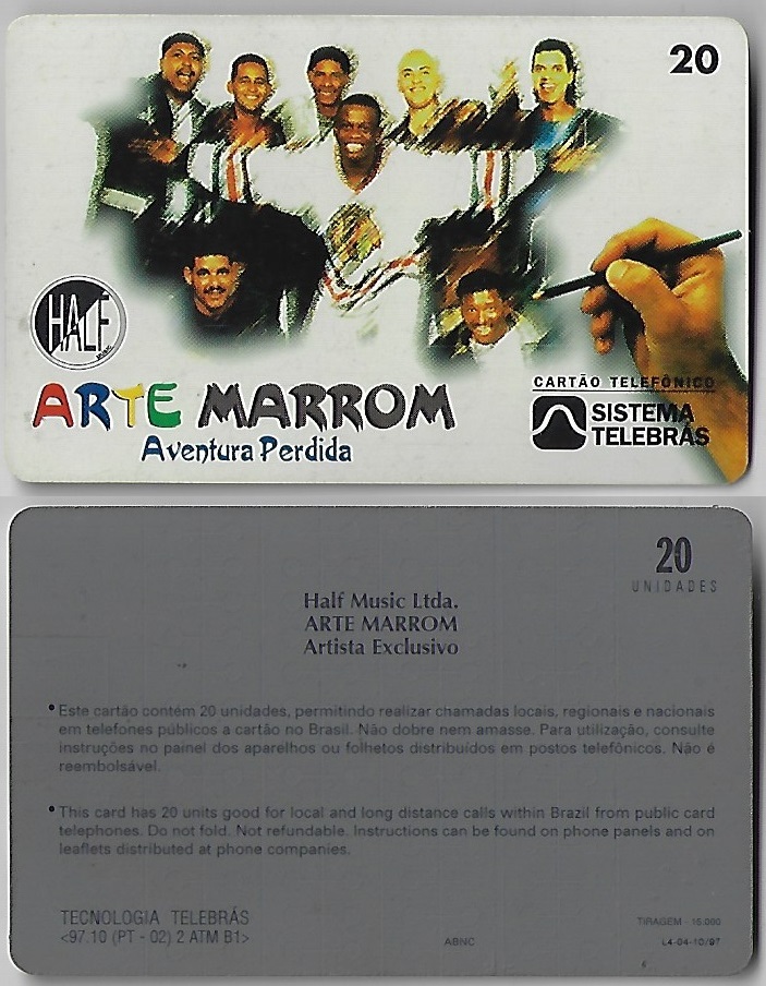 | 2985 | Telebrás, 1 cartão telefônico promocional "Half Music Ltda - Arte Marrom - Aventura Perdida", 1997, tiragem 15.000, usado | 5,00 | Foto |