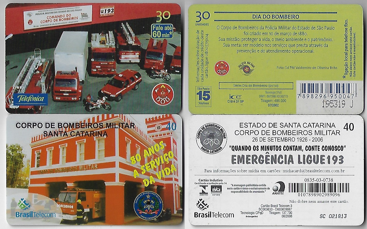| 77458 | Brasil, 2002/2006, Telecom e Telefônica, 2 cartões telefônicos do tema Corpo de Bombeiros de Santa Catarina e de São Paulo e Dia do Bombeiro | 2,00 | Foto |