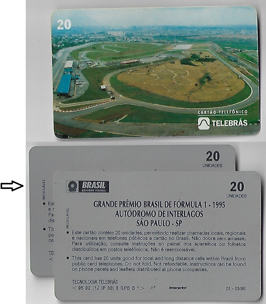 | 78410 | Telebrás, 2 cartões telefônicos Grande Prêmio de Fórmula 1 no Autódromo de Interlagos, 1995, cartão com e sem Logotipo, usados | 5,00 | Foto |