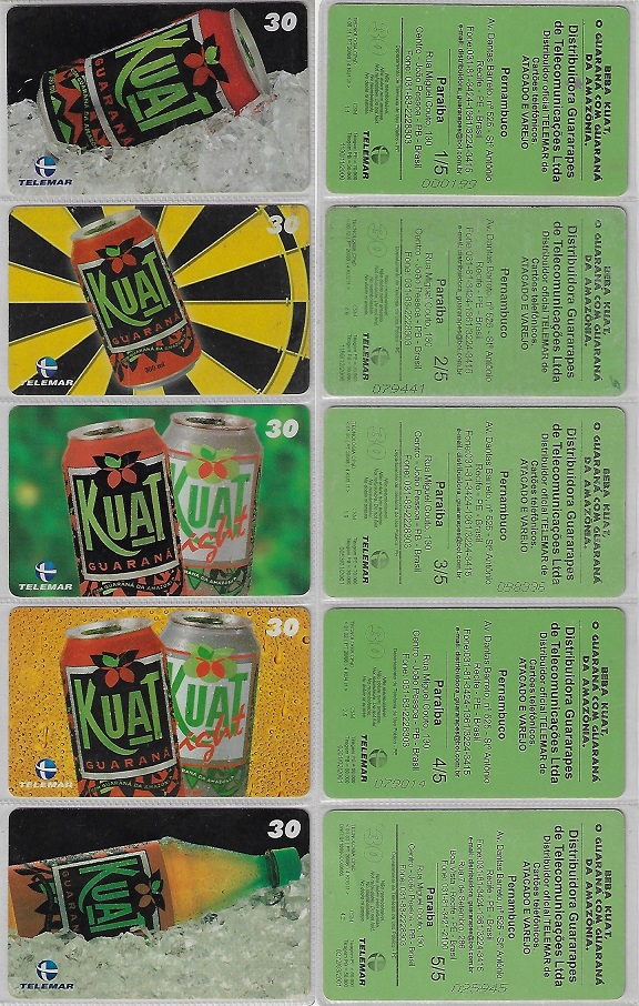| 83603 | Telemar, 5 cartões telefônicos da série "Guaraná Kuat", tiragem 100.000, completa, usados | 19,00 | Foto |