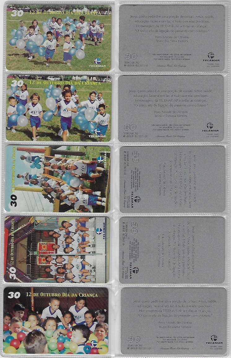 | 83616 | Telemar, 5 cartões telefônicos da série "12 de Outubro Dia da Criança", tiragem 13.025, usados | 29,00 | Foto |