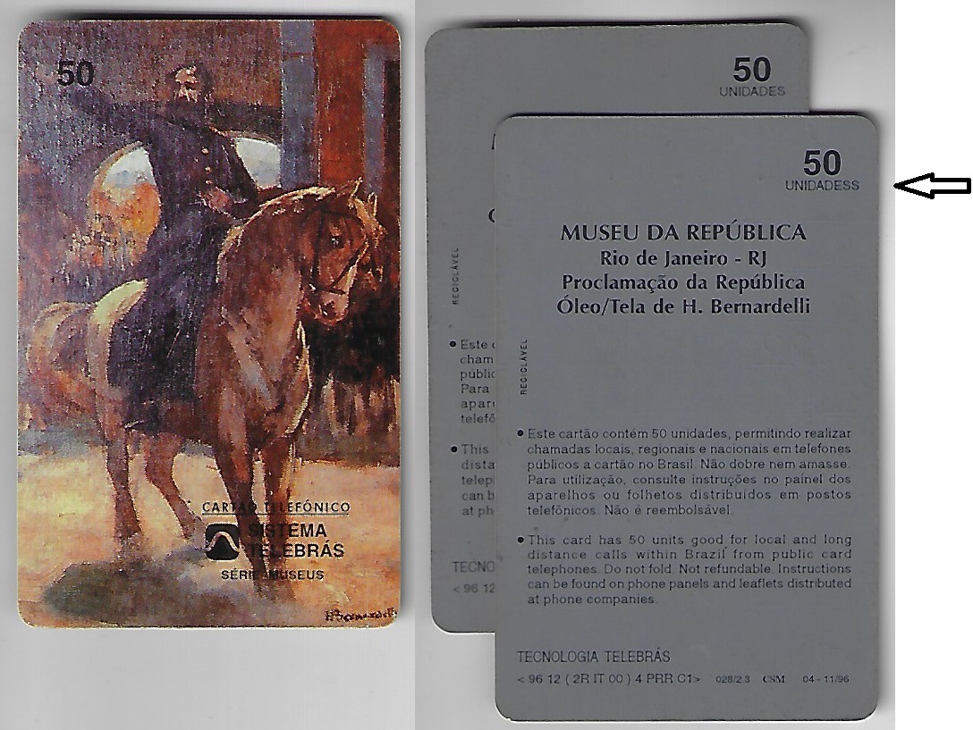 | 27965 | Telebrás, 2 cartões telefônicos Presidente Deodoro da Fonseca, cartão normal e outro com variedade "UNIDADESS", usados | 5,00 | Foto |
