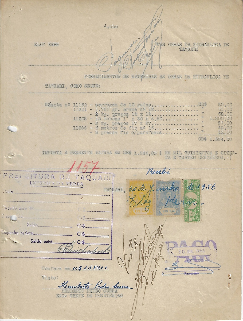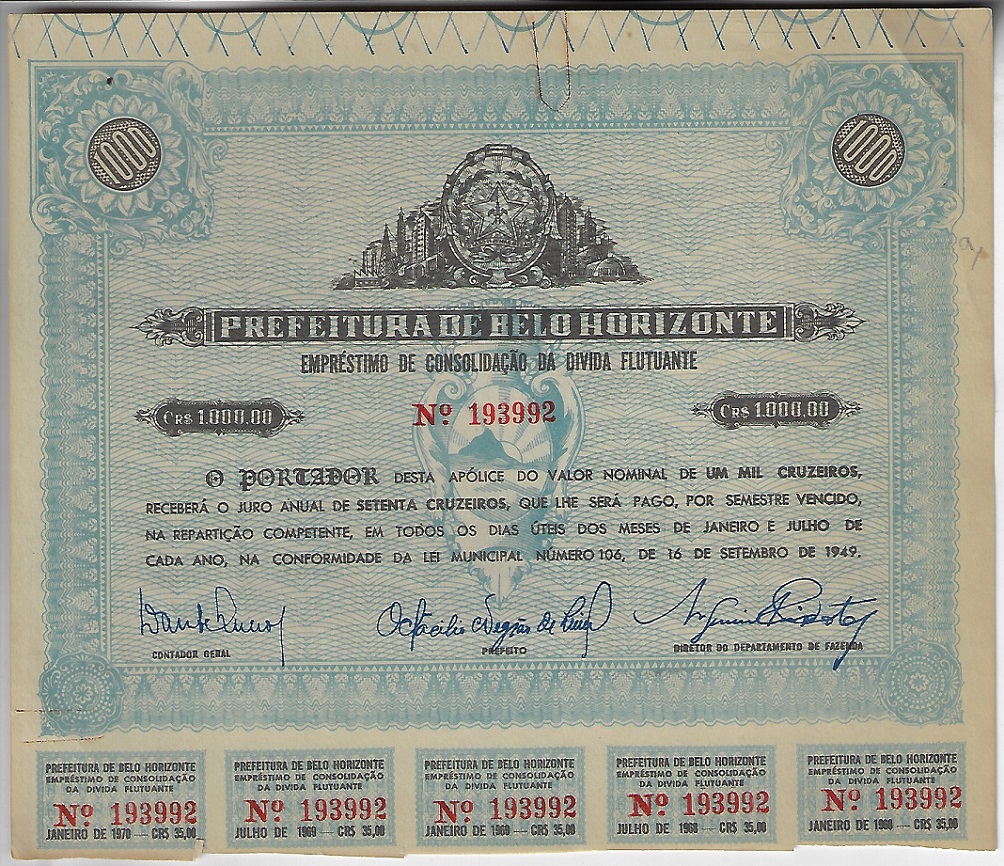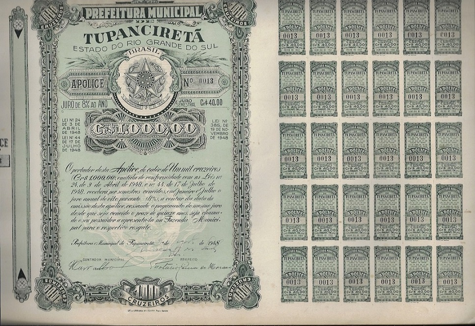 | 4628 | Brasil, 1948, apólice do Município de Tupanciretã / RS no valor de Cr$1.000, completa com todos os 30 coupons de Cr$40 cada, tamanho 32x50 cm, MBC | 30,00 | Foto |