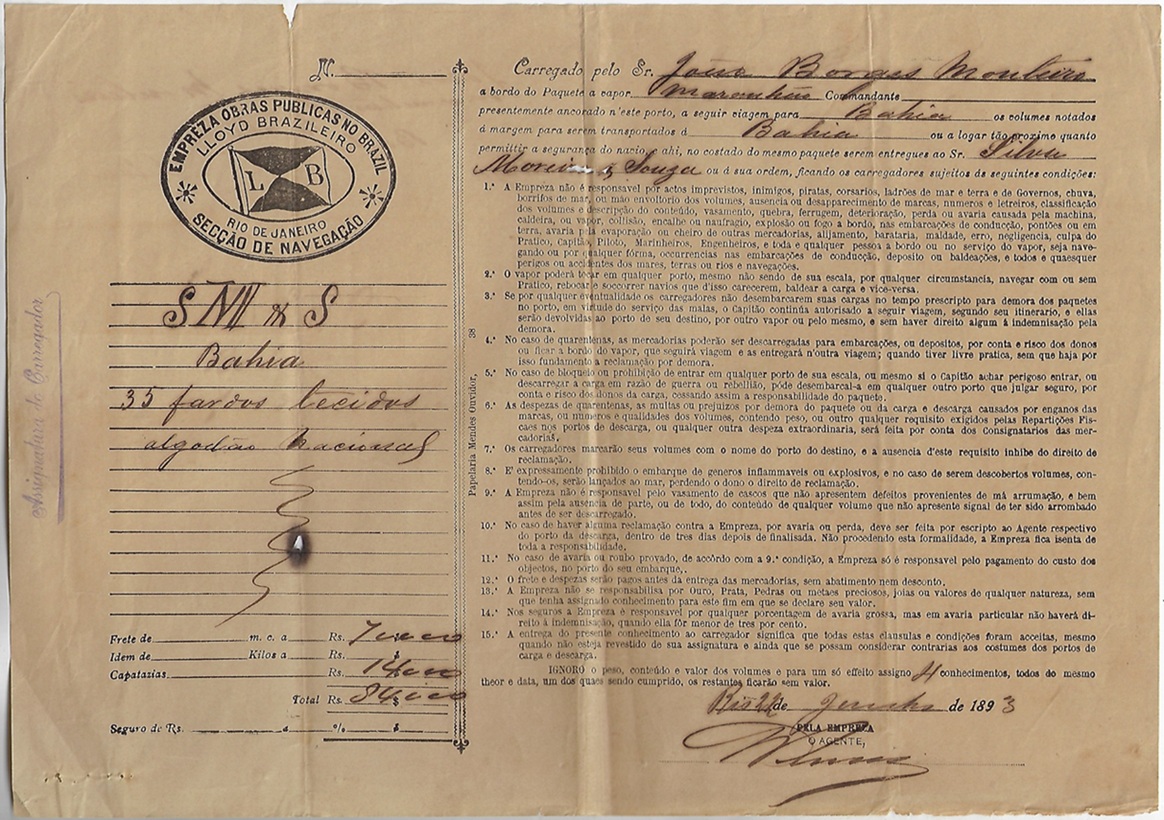 | 24459 | Brasil, 1893, conhecimento de embarque de carga de tecidos de algodão enviada pelo navio a vapor Maranhão, do Lloyd Brazileiro, do Rio de Janeiro (22/6) para Bahia | 20,00 | Foto |