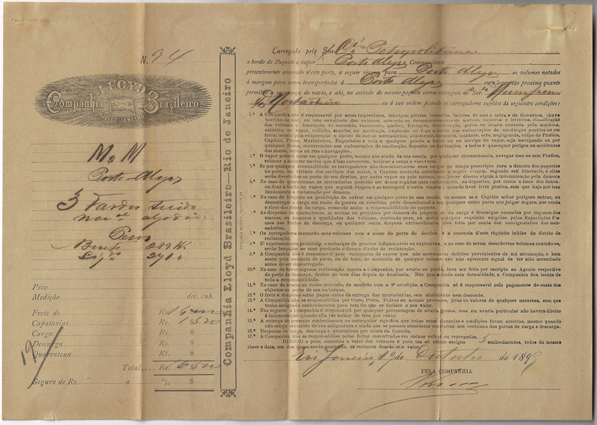 | 24624 | Brasil, 1899, conhecimento de embarque de carga de tecidos de algodão enviada pelo navio a vapor Porto Alegre, do Lloyd Brazileiro, do Rio de Janeiro (19/10) para Porto Alegre | 20,00 | Foto |