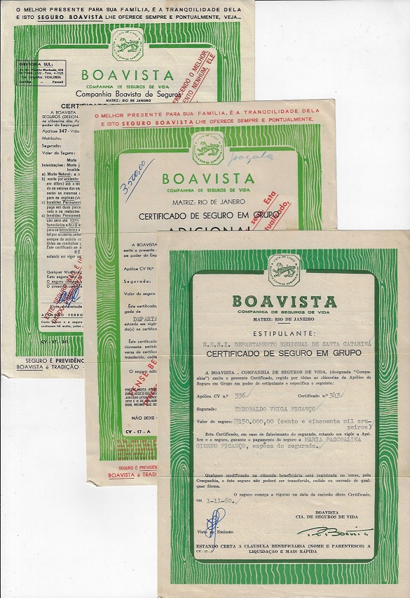 | 24918 | Brasil, 1960/1967, 3 certificados de seguro em grupo da Boa Vista Companhia de Seguros de Vida, tamanho 18,5x27 cm | 20,00 | Foto |