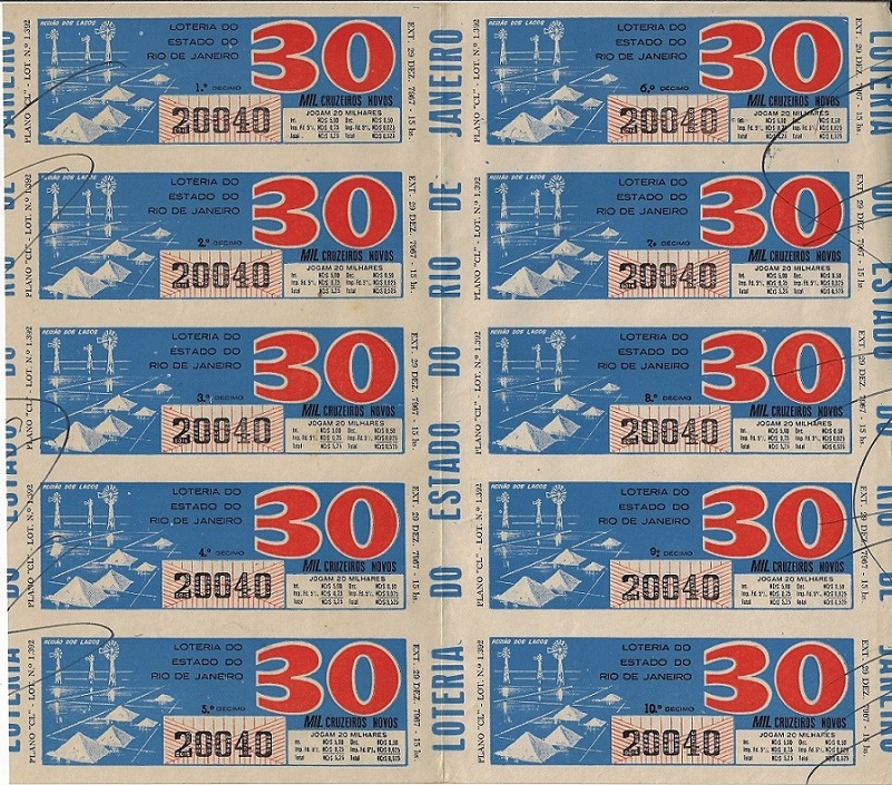 | 28260 | Brasil, 1967, folha inteira com 10 décimos da Loteria do Estado do RJ, extração 1392 de 29/12, retratando a região dos Lagos | 45,00 | Foto |