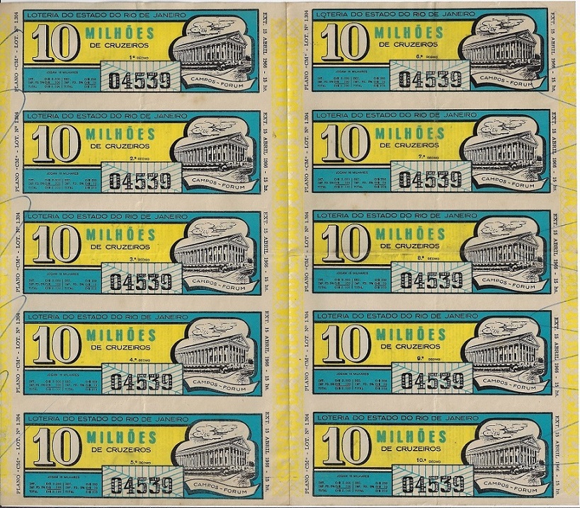 | 28261 | Brasil, 1966, folha inteira com 10 décimos da Loteria do Estado do RJ, extração 1304 de 15/04, retratando Campos - Fórum | 45,00 | Foto |