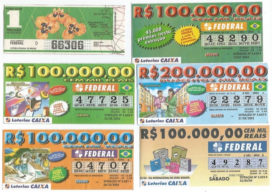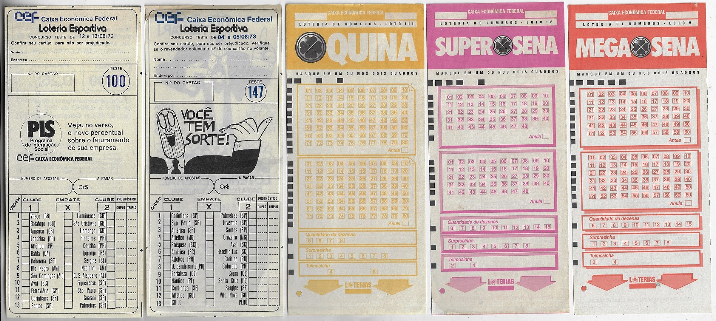 | 79361 | Brasil, 1972/1973, 2 volantes da Loteria Esportiva nº 100 e 147 + 1990s, 3 volantes de Loterias de Números da Caixa Econômica Federal: Quina, Super Sena e Mega Sena | 20,00 | Foto |