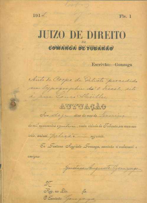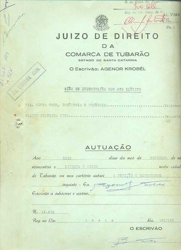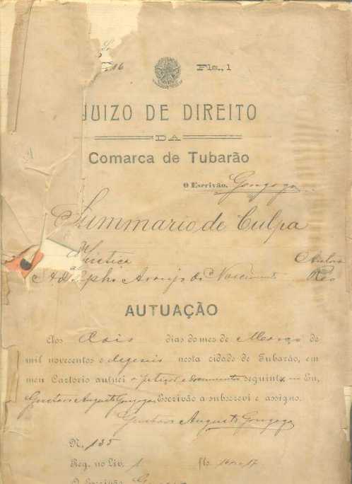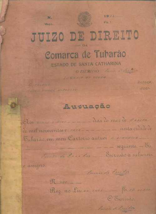 | 57102 | Brasil, 1914, Autuação, do Juízo de Direito da Comarca de Tubarão, completo com 7 folhas, sendo 1 com selo fiscal estadual | 40,00 | Foto |