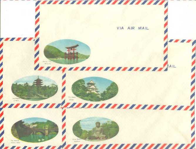 | 43794 | Japão, 1970s, 5 envelopes com desenhos retratando pontos turísticos do Japão, sem uso | 5,00 | Foto |