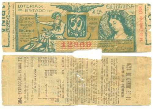 | 50051 | Brasil, 1928, Décimo de Bilhete de Loteria do Estado de Santa Catarina, o bilhete está dividido ao meio na vertical e foi reconstituído com fita adesiva transparente | 40,00 | Foto |