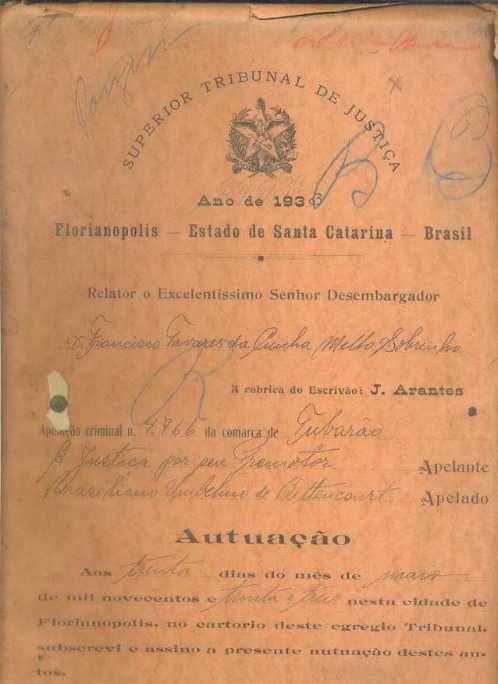 | 57107 | Brasil, 1933, Autuação, do Superior Tribunal de Justiça da Cidade de Florianópolis, completo com 46 folhas | 40,00 | Foto |