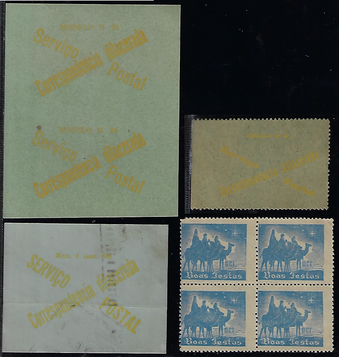 | 63219 | Brasil, 1930s, 4 etiquetas de fechamento dos Correios "Serviço Postal - Correspondência Dilacerada", e quadra com etiquetas de fechamento para Mensagens Sociais de Natal | 50,00 | Foto |