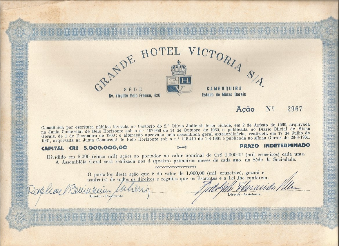 | 63529 | Brasil, 1961, ação ao portador do Grande Hotel Victoria, em Cambuquira / MG, tamanho 22x33 cm | 20,00 | Foto |