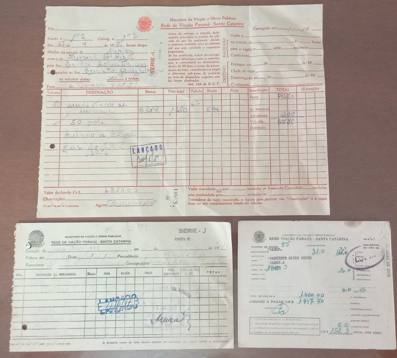 | 63558 | Brasil, 1952/1957, envelope timbrado para pagamento de funcionário e 2 faturas timbradas da Rede Viação Paraná - Santa Catarina (Ferrovia) | 20,00 | Foto |