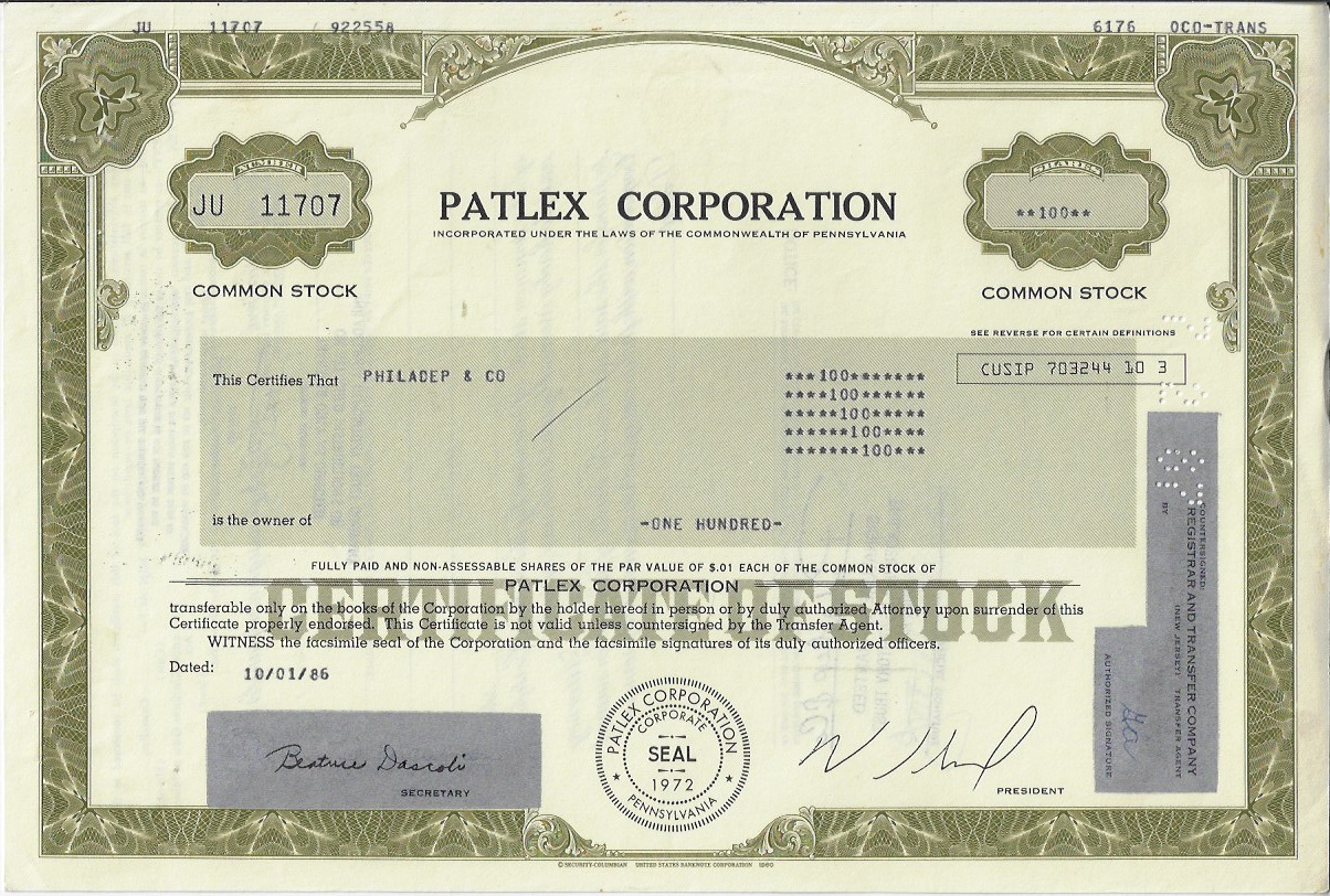 | 65393 | EUA, 1986, ação da empresa Patlex Corporation | 15,00 | Foto |