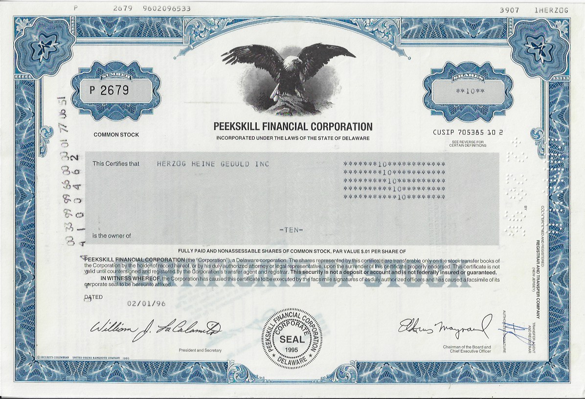 | 65412 | EUA, 1996, ação da empresa Peekskill Financial Corporation | 15,00 | Foto |
