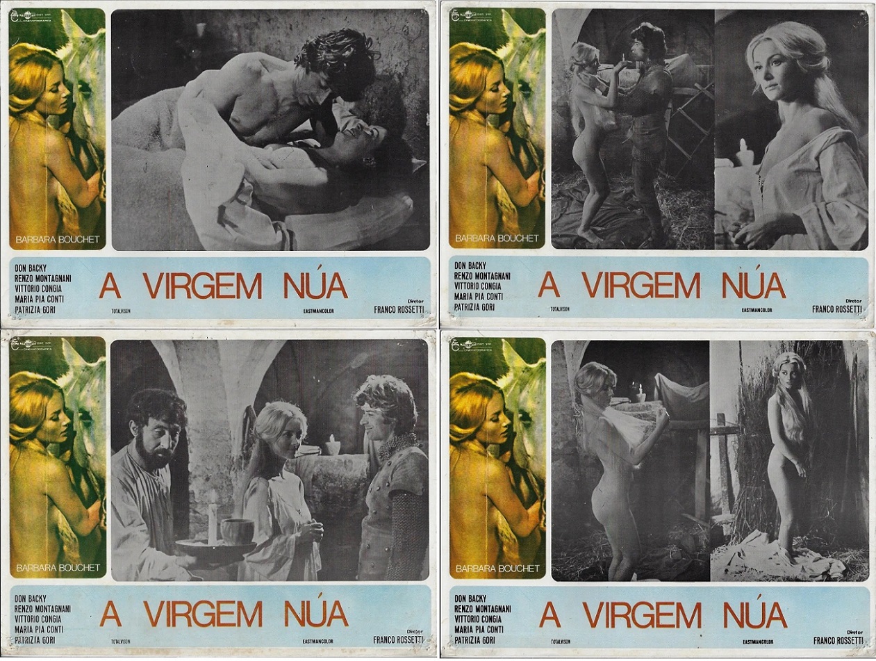 | 66071 | Brasil, 1972, 4 Pôsteres diferentes tipo Lobby card do filme italiano "Una cavalla tutta nuda (A virgem nua)", dirigido por Franco Rossetti, tamanhos 24x32 cm, mínimos furos de tachinha nos cantos | 32,77 | Foto |
