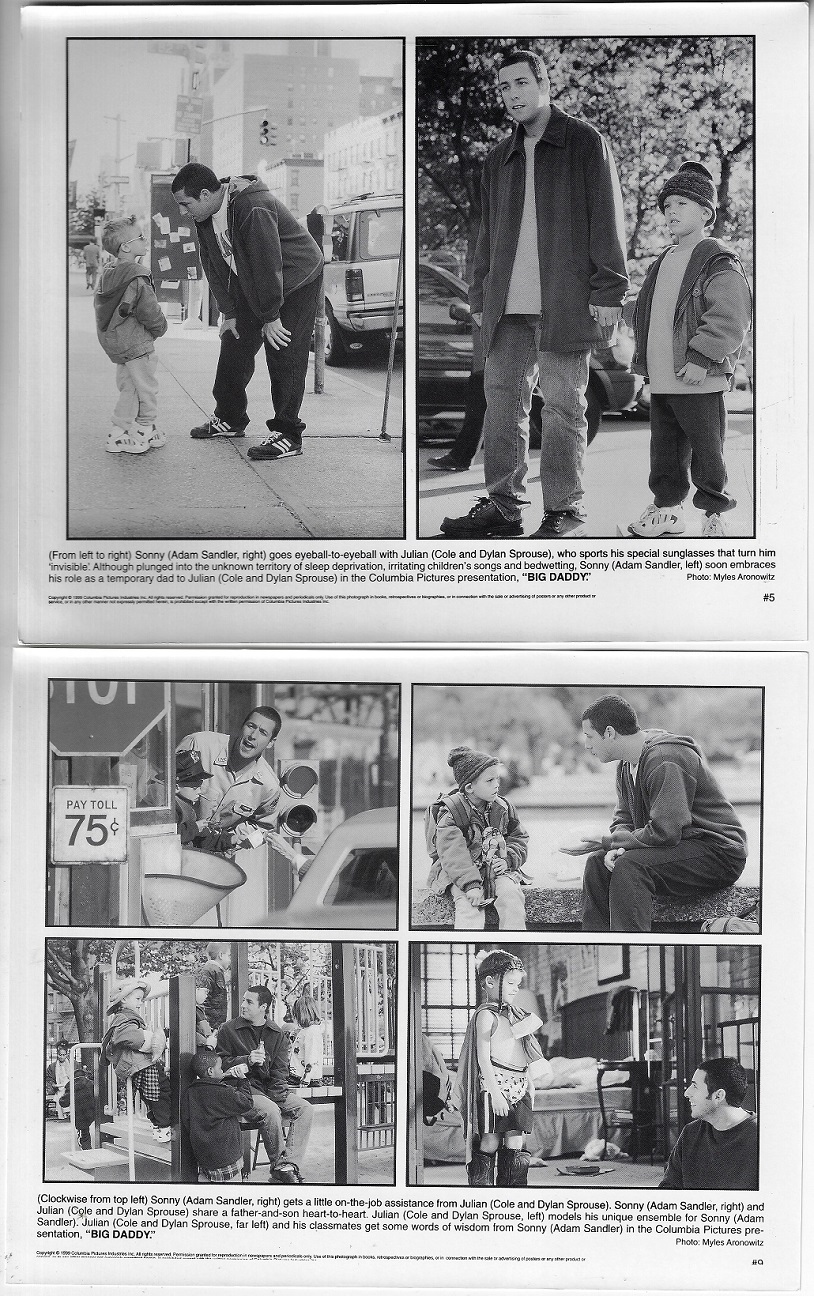 | 66211 | EUA, 1999, 2 Pôsters tipo Lobby Card do filme "Big Daddy (O Paizão)", tamanho 20x25 cm, ator Adam Sandler, identificado a caneta no verso | 16,00 | Foto |