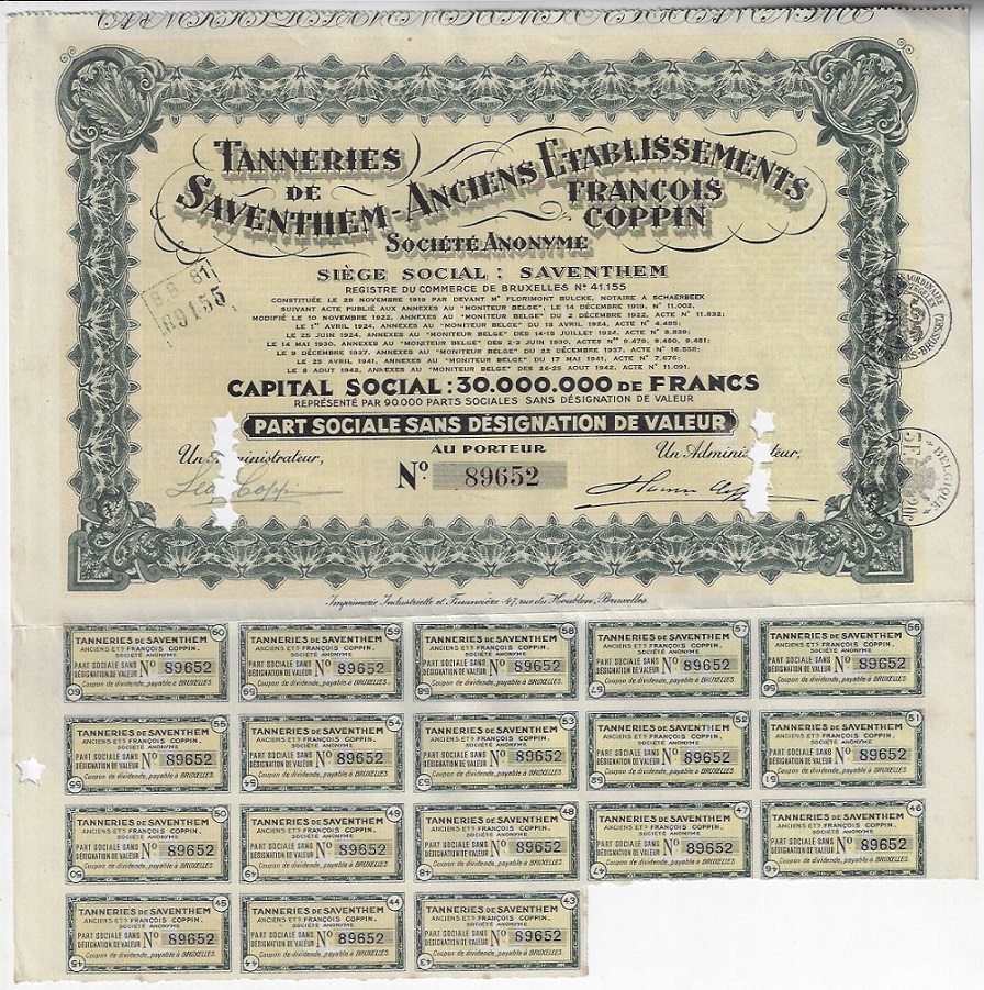 | 69790 | Bélgica, 1940s, Ação da empresa Tammeries de Saventhem - Anciens Etablissements François Coppin, com 18 coupons, tamanho 17x28 cm | 32,00 | Foto |