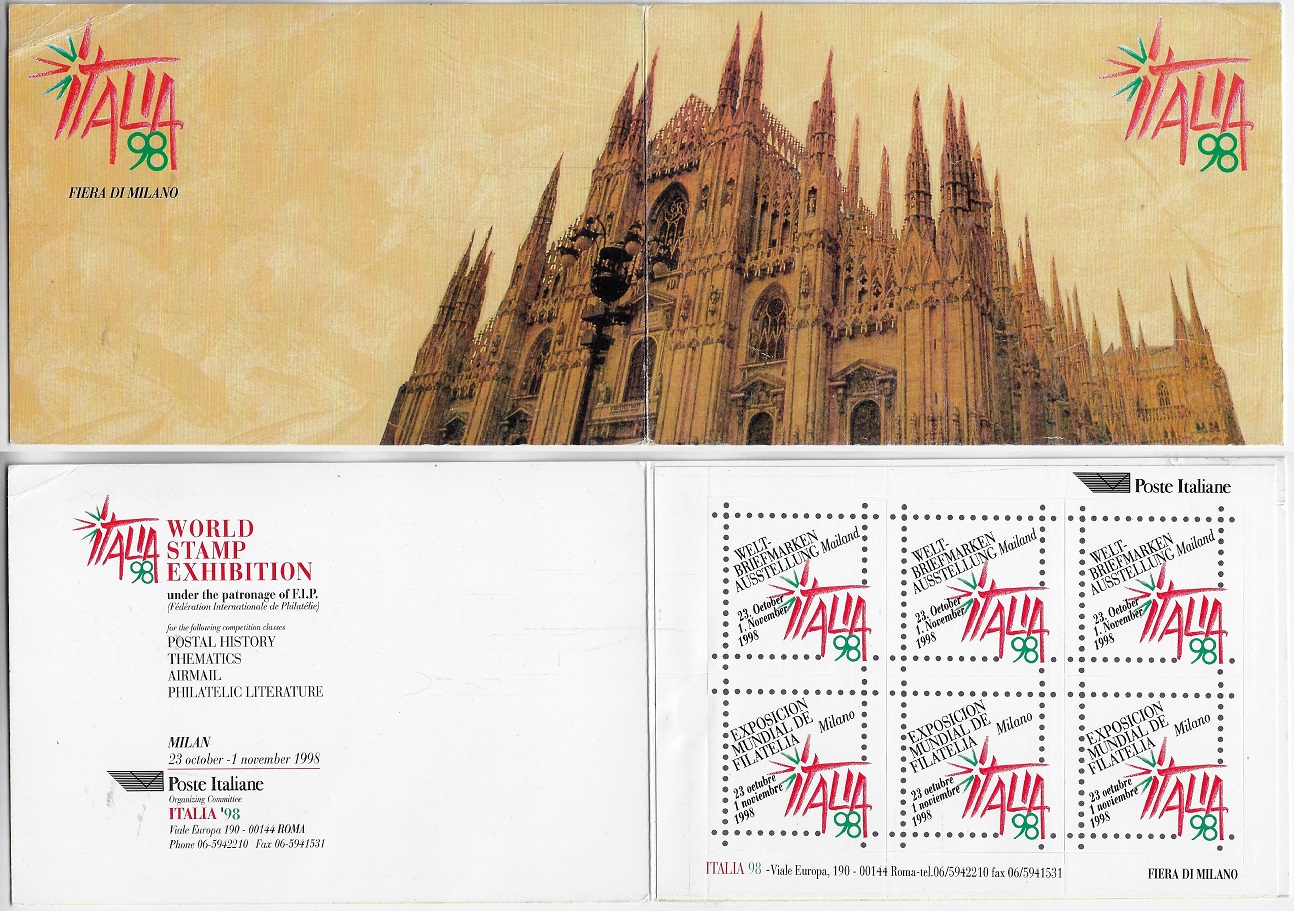 | 70379 | Itália, 1998, caderneta figurando Catedral de Milão, emitida pelo Correio Italiano com folhinha de 6 etiquetas alusivas a Exposição Internacional de Filatelia, em Milão, textos das etiquetas em alemão e espanhol, sem uso, dobra no canto superior direito | 10,00 | Foto |