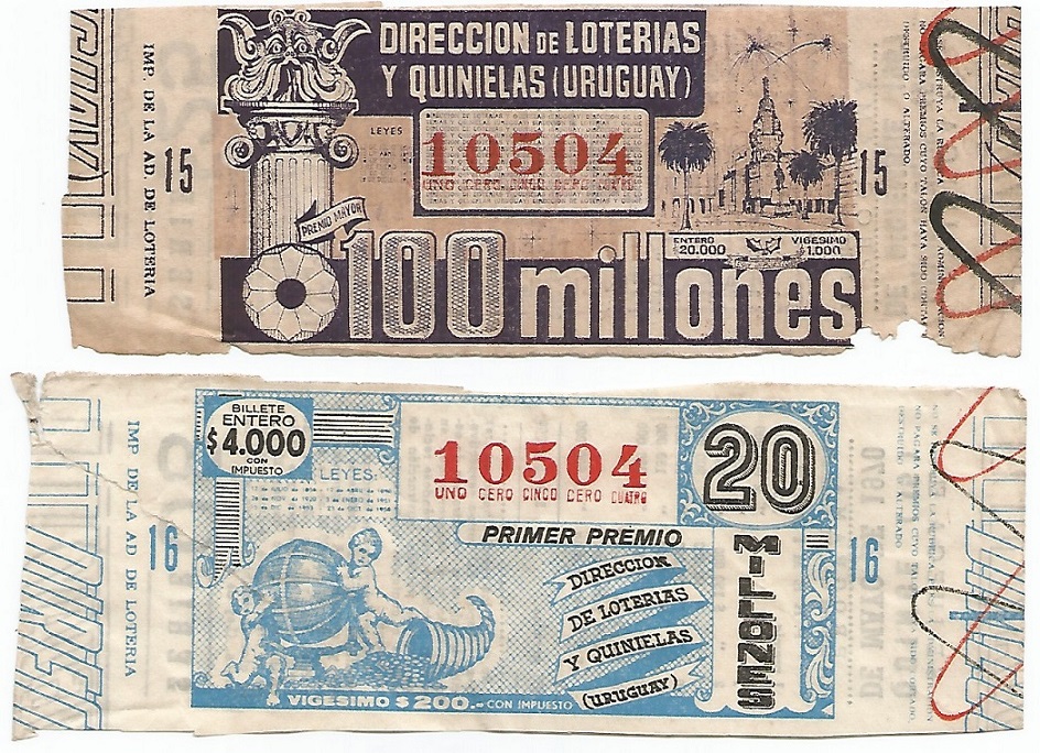 | 72897 | Uruguai, 1967/1970, 2 bilhetes de loteria diferentes, mau estado | 7,00 | Foto |