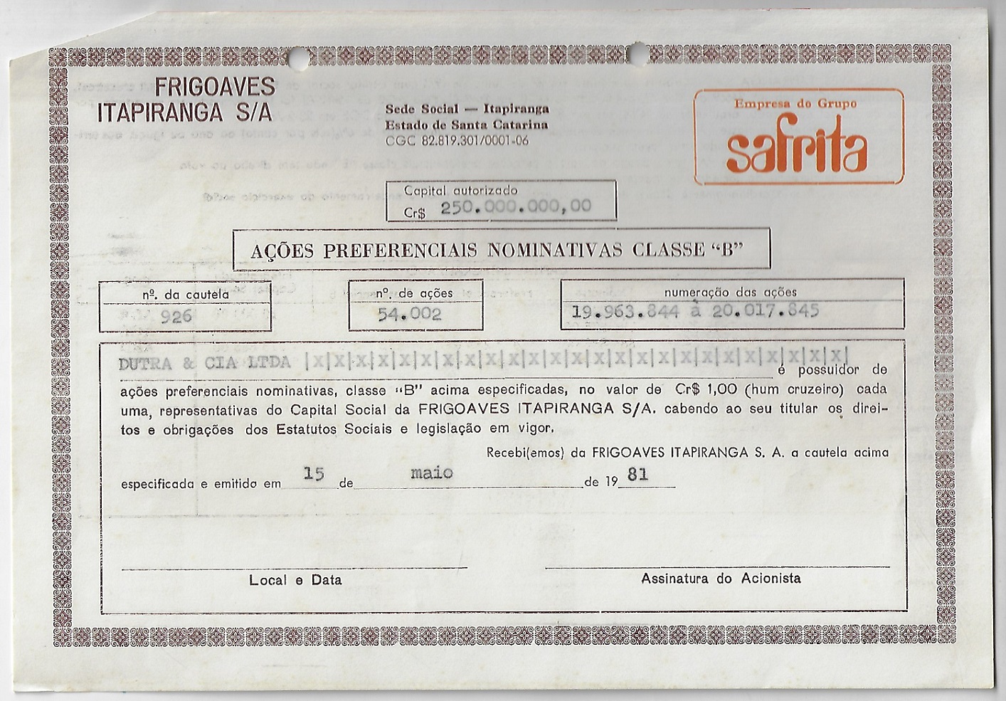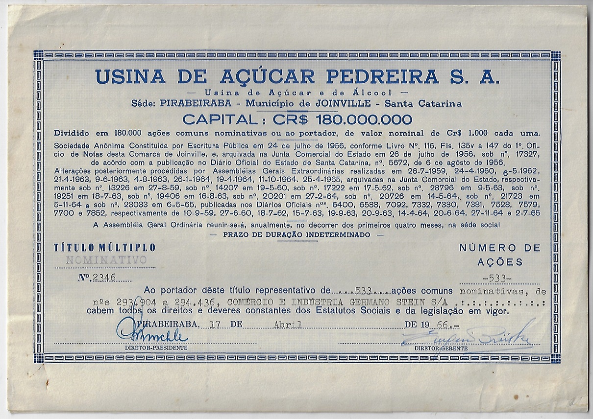 | 72938 | Brasil, 1966, 533 ações comuns nominativas da Usina de Açúcar Pedreira, de Joinville, com 14 coupons de Dividendo, tamanho 18,5x26 cm | 20,00 | Foto |