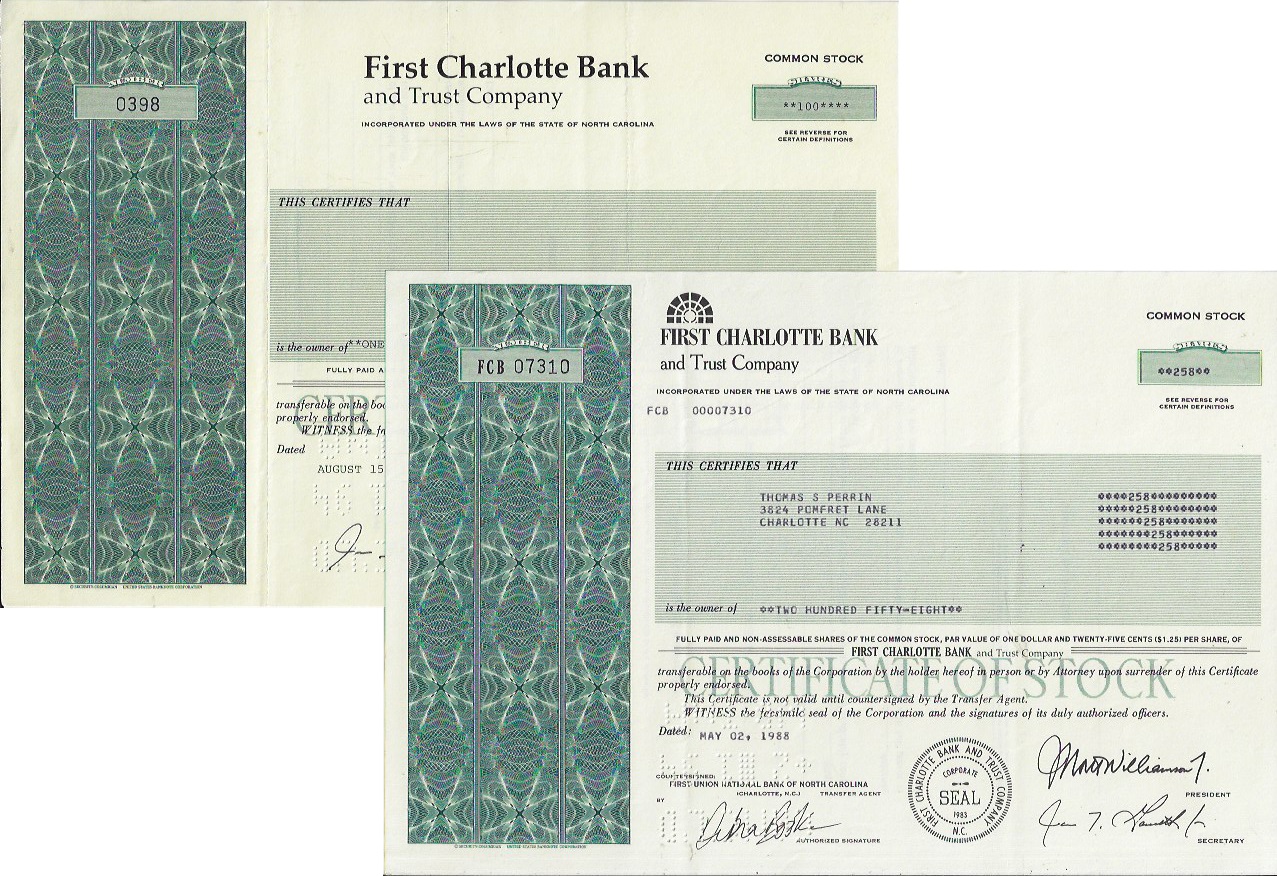 | 72960 | EUA, 1983/1988, 2 Ações da empresa First Charlotte Bank and Trust Company | 20,00 | Foto |