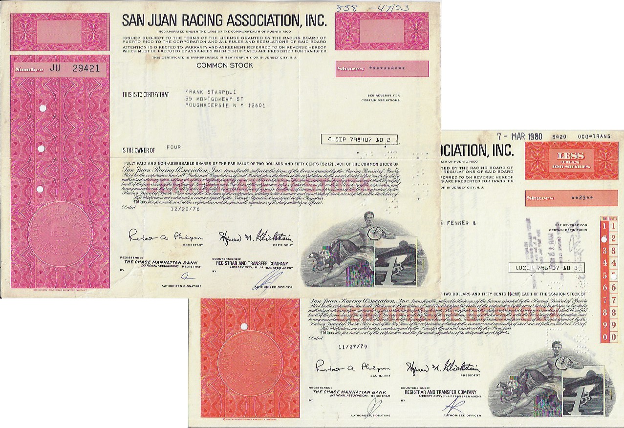 | 72963 | EUA, 1976/1979, 2 Ações da empresa San Juan Racing Association, Inc. | 20,00 | Foto |
