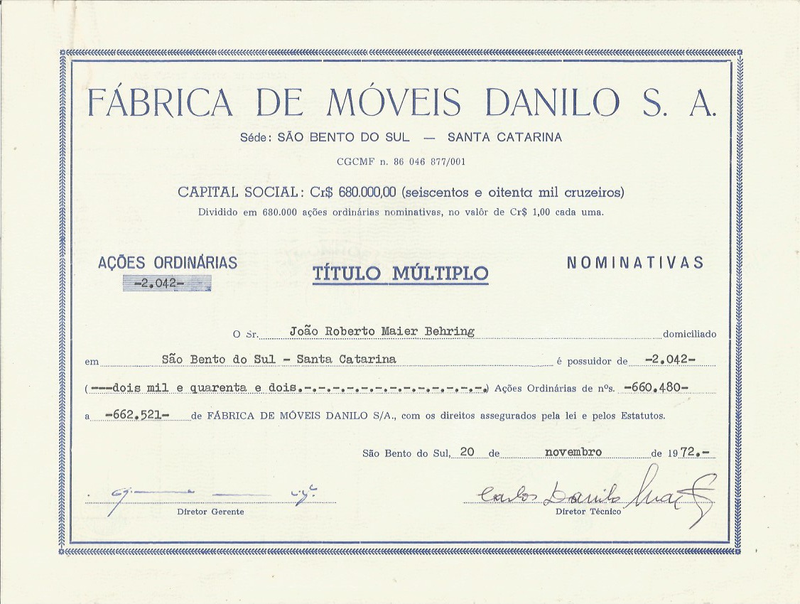 | 73296 | Brasil, 1972, 2042 Ações Ordinárias Nominativas da Fábrica de Móveis Danilo S.A., de São Bento do Sul / SC, tamanho 22x28,5 cm | 20,00 | Foto |