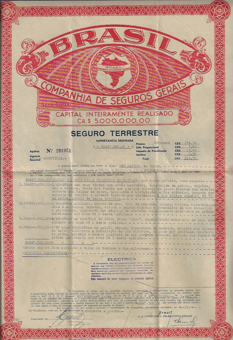 | 73398 | Brasil, 1944, apólice de seguro terrestre da Brasil - Companhia de Seguros Gerais | 25,00 | Foto |