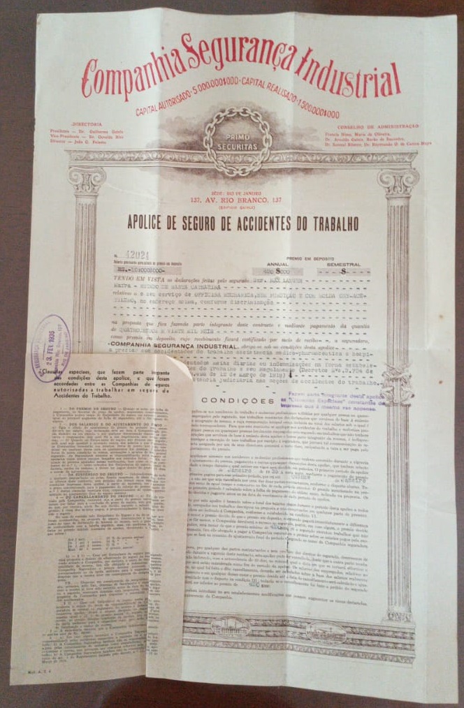 | 73399 | Brasil, 1935, apólice de seguro contra acidentes do trabalho da Companhia Segurança Industrial, com 3 selos fiscais federais, alguns roídos nas dobras, acompanham 2 documentos relacionados com a mesma apólice | 30,00 | Foto |